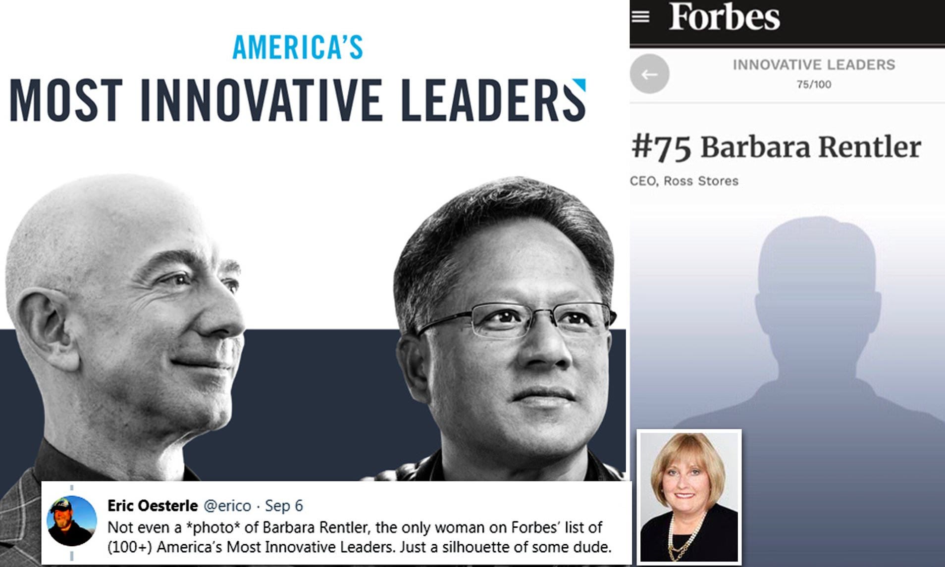 Lastly September Forbes published “America’s Most Innovative Leaders” list, profiling one hundred of “the most creative and successful business minds of today.” Ninety-nine of the top one hundred list were men (and barely a sprinkle men of color). You had to scroll down to # 75, Ross Stores’ CEO Barbara Rentler, to see the one woman mentioned, and she didn’t get so much as a headshot — just a masculine silhouette in gray (which has since been updated to resemble a female). YOU CAN’T MAKE THIS STUFF UP.